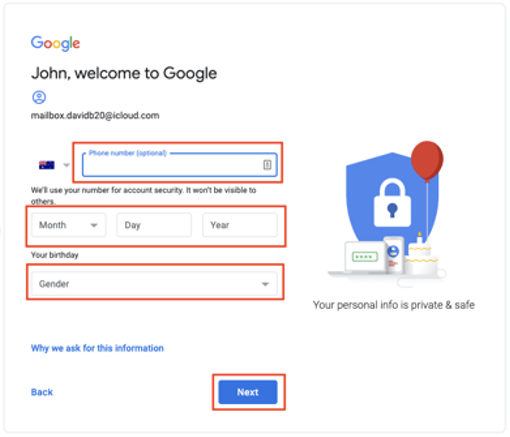 - Enter your Phone Number, Birthday, and Gender, then click Next.