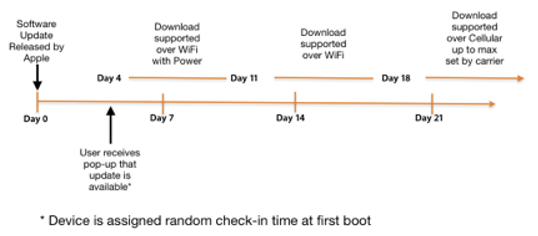 User checks in settings if an update is available. If an update is found, Apple will try to auto-download it when the device is plugged-in to power and connected to WiFi for the next 7 days. If the auto-download cannot be completed, the user can still download the update manually while connected to WiFi (plugged-in to power not required) within the 7 days. After the 7 day window expires, the user is then allowed to download the update over cellular by doing a manual check again in settings. At any stage of the process the user must acknowledge and accept the update before it is installed on the device.