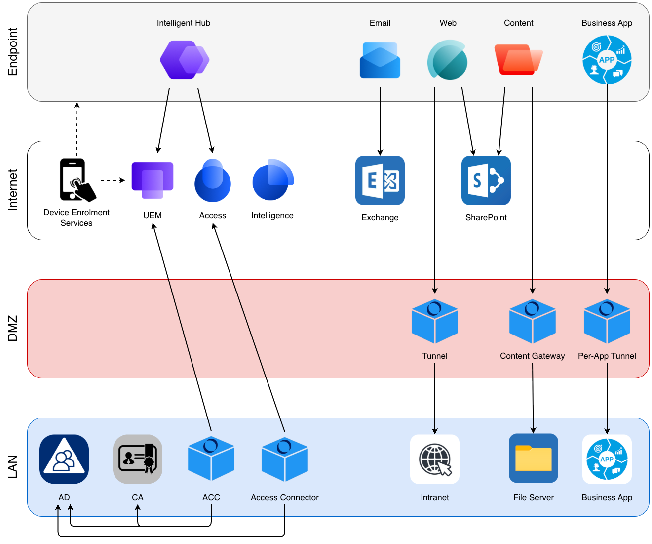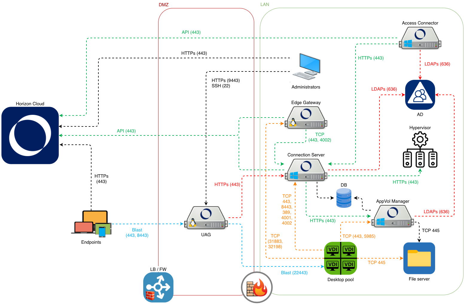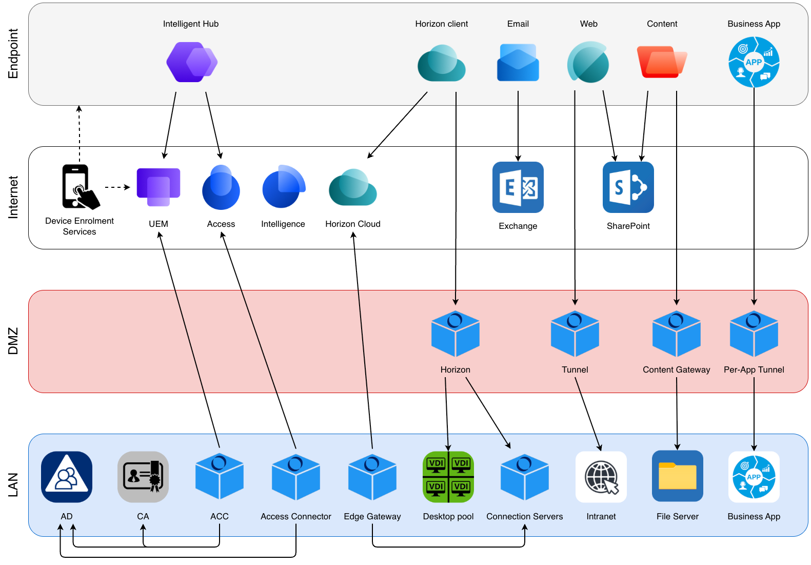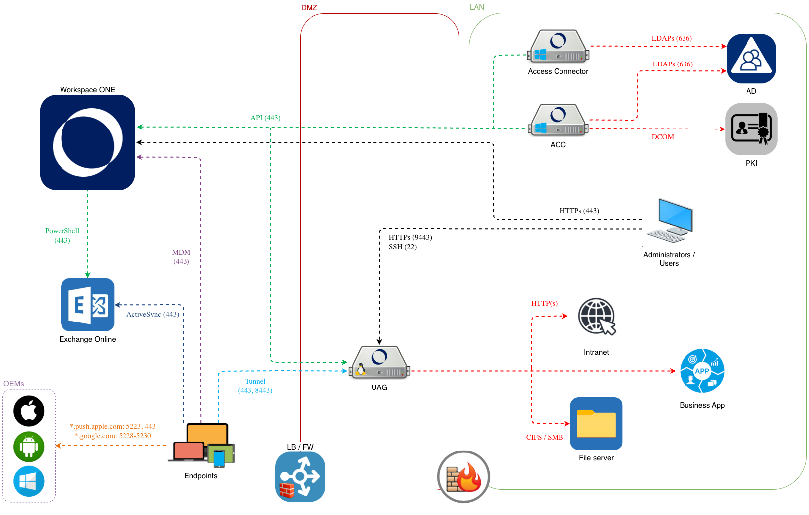 During a Proof of Concept, network diagrams help bridge the gap between design assumptions and real-world implementation. The following diagrams illustrate the high-level architecture, key integration points, and data flows involved in the Omnissa platform. They are intended to validate design decisions, highlight dependencies, and serve as a reference during testing and issue resolution.