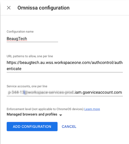 - Paste the URLs matcher and service account details copied from Omnissa Access